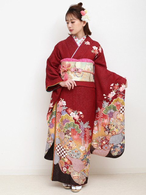 振袖・袋帯・帯締め・帯揚げ・二部式筒袖襦袢・重ね衿・襟芯・帯枕・帯板・腰紐・三重ひも・伊達締め・草履・バッグ・足袋・肌着