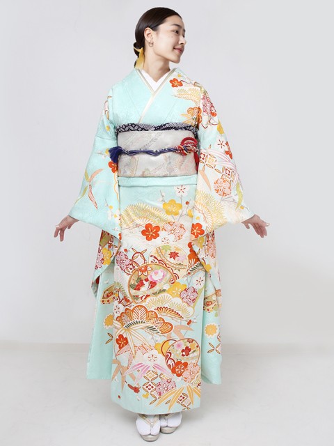振袖・袋帯・帯締め・帯揚げ・二部式筒袖襦袢・重ね衿・襟芯・帯枕・帯板・腰紐・三重ひも・伊達締め・草履・バッグ・足袋・肌着
