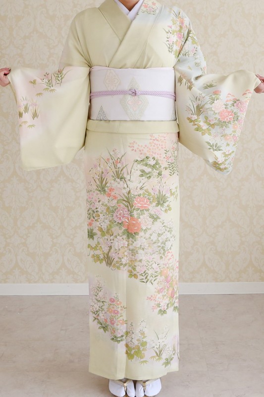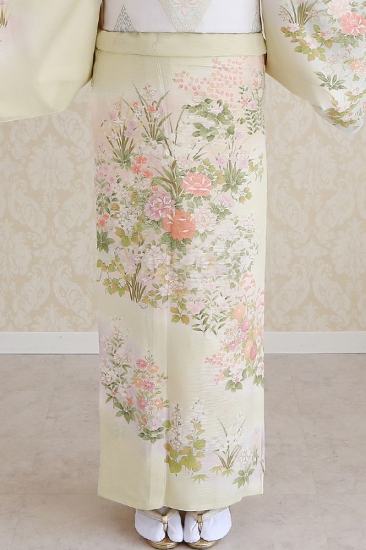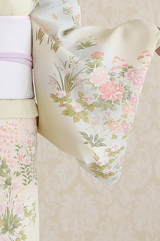 淡い黄緑の地色に、花々が咲き誇ります。絽の涼やかさとともに、華やかで風雅な装いを…。