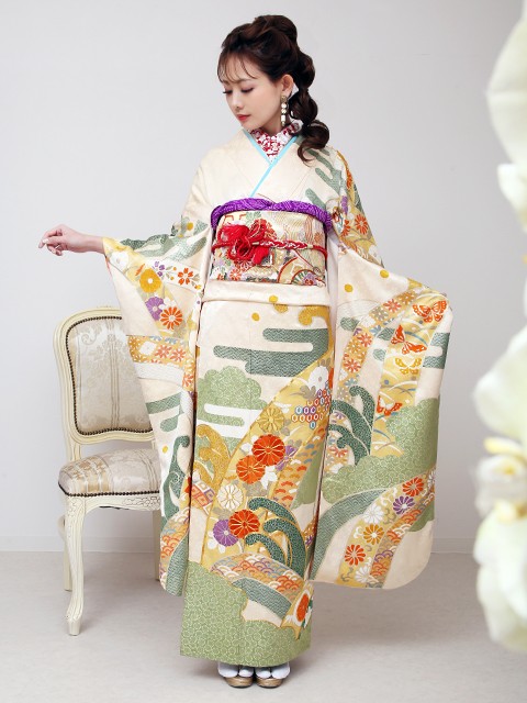 振袖・袋帯・帯締め・帯揚げ・二部式筒袖襦袢・重ね衿・襟芯・帯枕・帯板・腰紐・三重ひも・伊達締め・草履・バッグ・足袋・肌着